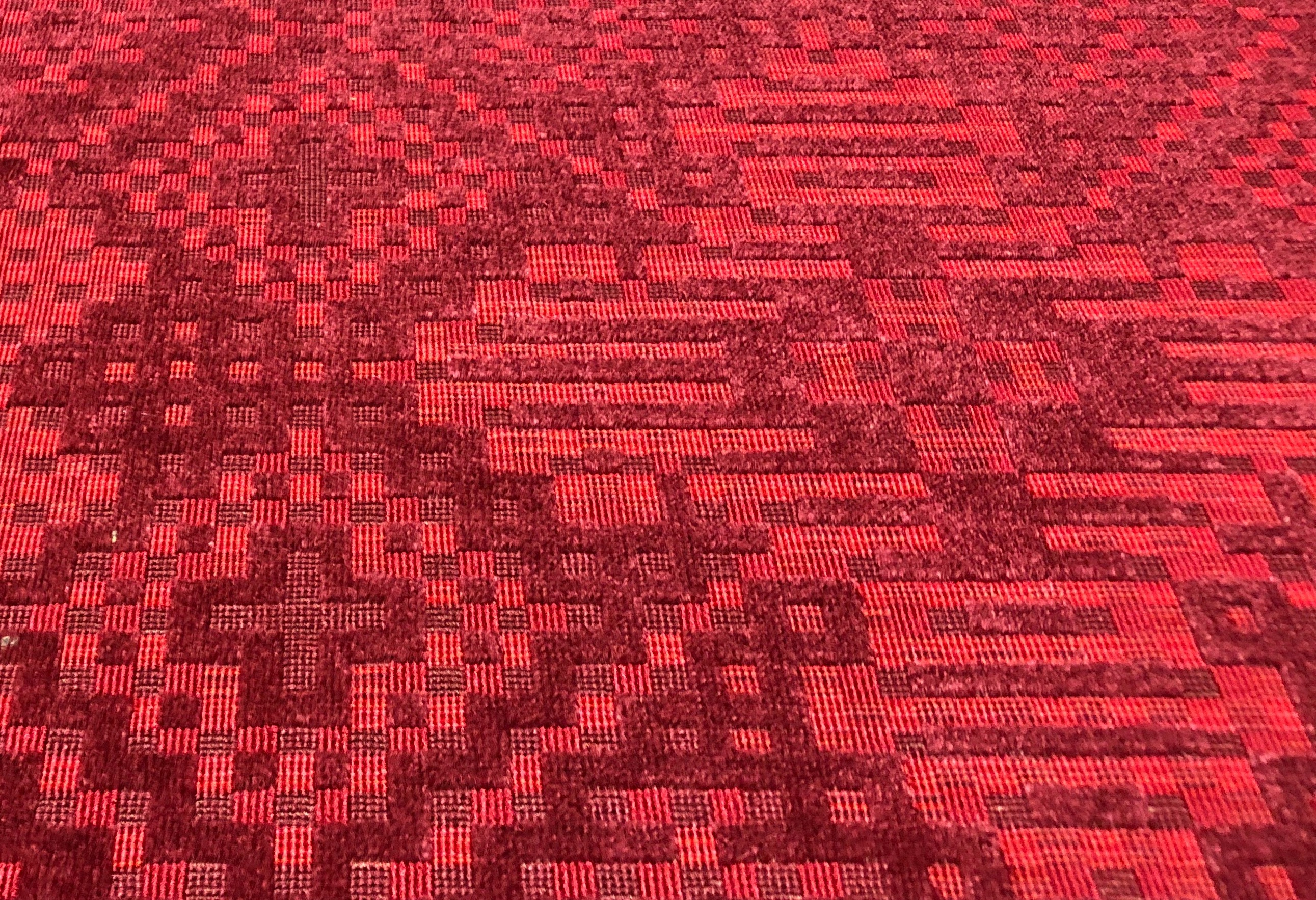 Designed and woven at Material Technology and Logistics for their 2019 Proposte presentation. These cut-and-loop velvets use custom planted bobbin layouts with varied yarn types and colors across three mixing creel frames to create richly varied but subtle surfaces that mimic the look of overdyed carpets. New weaves were explored to achieve multiple depths in the line work.